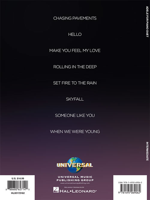 Artist: Adele Adele for Piano Duet 1 Piano, 4 Hands / Intermediate Level Softcover Eight of Adele's biggest hits arranged especially for intermediate piano duet! Featuring: Chasing Pavements · Hello · Make You Feel My Love...Regular price $17.99 -