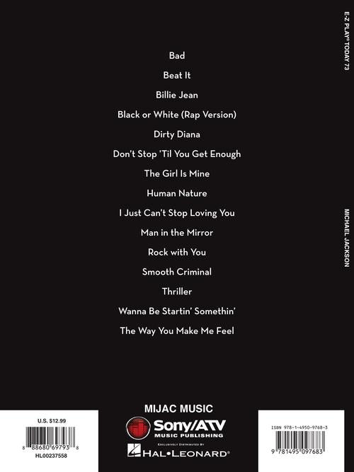 Michael Jackson E-Z Play Today #73 Publisher: Hal Leonard Category: Keyboard & Piano/Vocal/Guitar Series: E-Z Play Today Format: Softcover 15 great hits presented in our patented E-Z Play Today notation with note-names in the note heads...Regular price $22.99 -