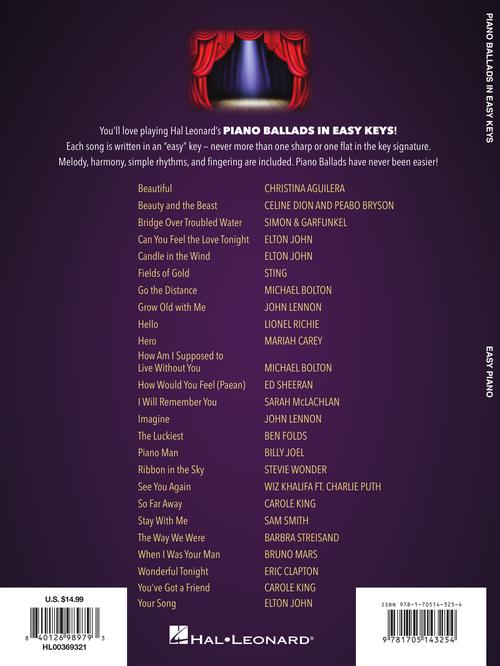 Piano Ballads - In Easy Keys Never More Than One Sharp or Flat! Publisher: Hal Leonard Category: Keyboard & Piano/Vocal/Guitar Series: Easy Piano Songbook Format: Softcover You'll love playing from the Hal Leonard In Easy Keys...Regular price $19.99 -