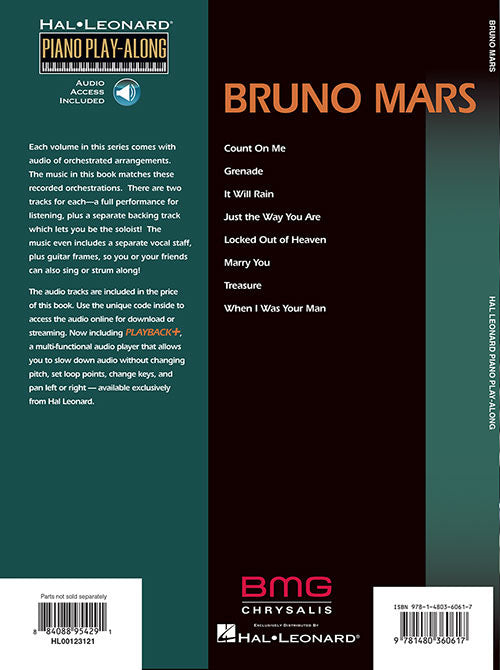 Bruno Mars Piano Play-Along Volume 126 Publisher: Hal Leonard Category: Keyboard & Piano/Vocal/Guitar Series: Piano Play-Along Format: Softcover Audio Online Your favorite sheet music will come to life with the innovative Piano Play-Along series! With these...Regular price $27.99 -