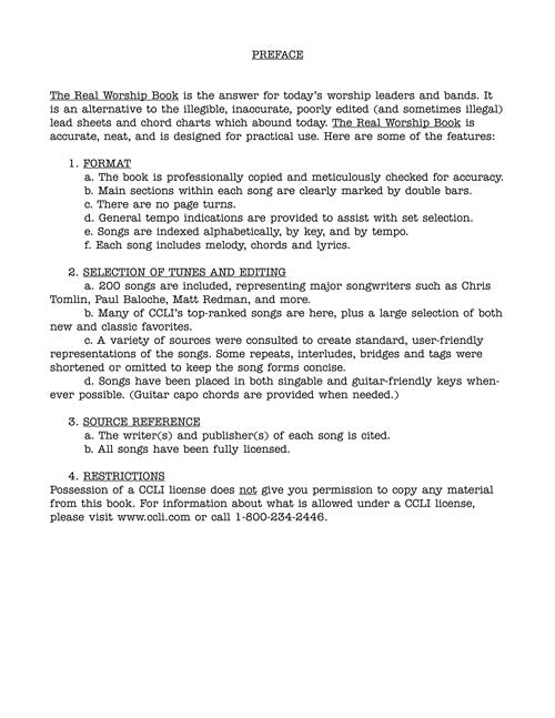 Composer: Various The Real Worship Book C Instruments Publisher: Hal Leonard Category: Keyboard & Piano/Vocal/Guitar Series: Fake Book Format: Softcover All the Real Books feature hundreds of time-tested songs in extremely accurate arrangements; the famous large,...Regular price $41.99 -