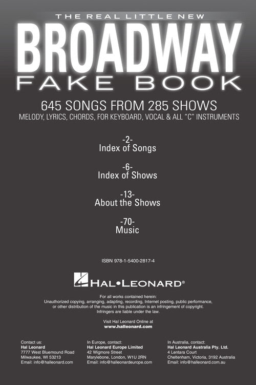 Composer: Various The Real Little New Broadway Fake Book 645 Songs from 285 Shows Publisher: Hal Leonard Category: Keyboard & Piano/Vocal/Guitar Series: Fake Book Format: Softcover Melody, lyrics and chords are provided in this miniature comb-bound...Regular price $47.99 -