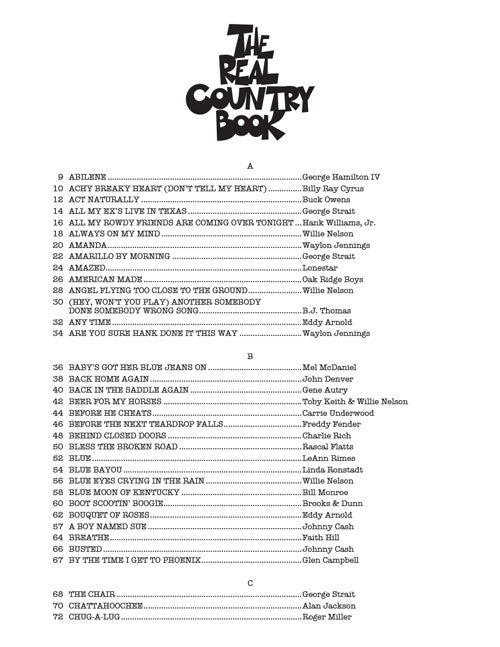 Artist: Various The Real Country Book C Instruments Softcover Country gets real in this new collection in the Real Book series featuring over 275 country favorites presented in the Real Book look with lead sheets and...Regular price $59.99 -