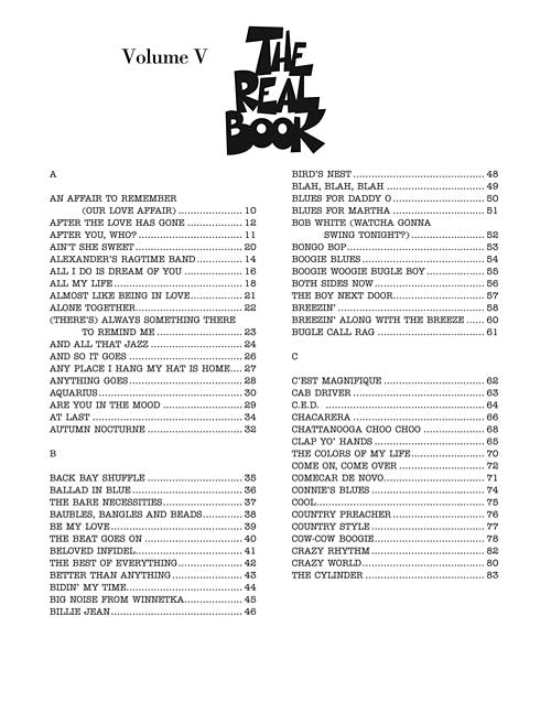 Artist: Various The Real Book - Volume V C Edition Publisher: Hal Leonard Category: Keyboard & Piano/Vocal/Guitar Series: Fake Book Format: Softcover Since the 1970s, The Real Book has been the most popular book for gigging...Regular price $59.99 -