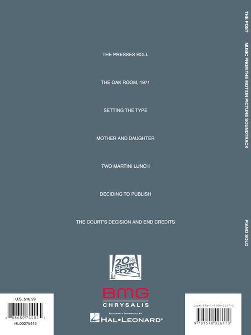 The Post Music from the Motion Picture Soundtrack Publisher: Hal Leonard Category: Keyboard & Piano/Vocal/Guitar Series: Piano Solo Songbook Format: Softcover Steven Spielberg and John Williams have joined forces once again on a critically acclaimed movie...Regular price $20.99 -