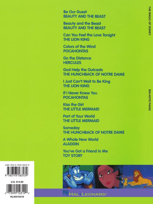 Composer: Various The Magic of Disney Publisher: Hal Leonard Category: Keyboard & Piano/Vocal/Guitar Series: Big Note Songbook Format: Paperback 13 of Disney's most-loved songs arranged for even beginning players to enjoy, including: Beauty and the Beast...Regular price $23.99 -