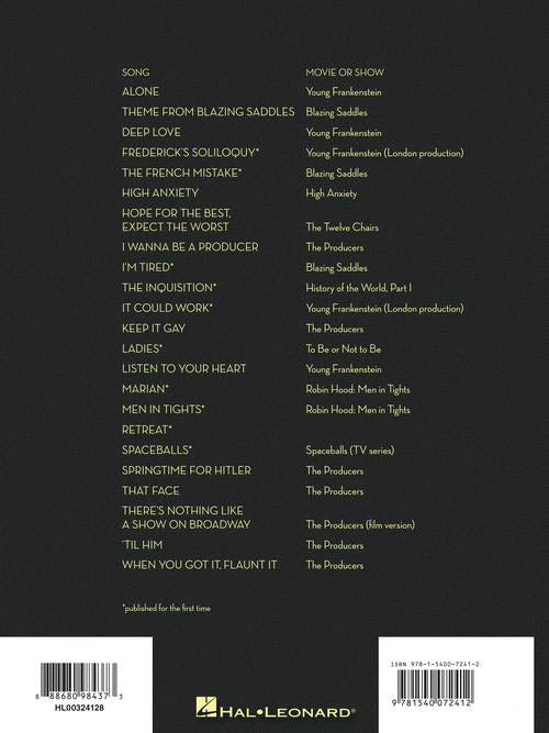 Composer: Mel Brooks The Mel Brooks Songbook 23 Songs from Movies and Shows with a preface by Mel Brooks Publisher: Hal Leonard Category: Keyboard & Piano/Vocal/Guitar Series: P/V/G Composer Collection Format: Softcover The great comedy filmmaker...Regular price $27.99 -