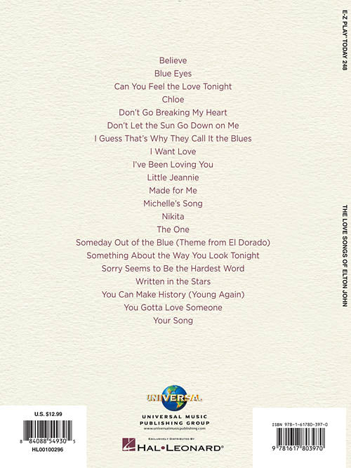 The Love Songs of Elton John E-Z Play Today Volume 248 Publisher: Hal Leonard Category: Keyboard & Piano/Vocal/Guitar Series: E-Z Play Today Format: Softcover 21 timeless ballads from Sir Elton, including: Can You Feel the Love...Regular price $15.99 -
