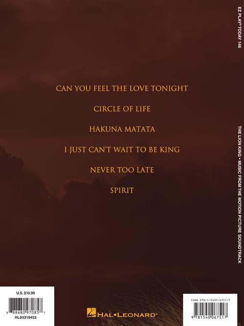 The Lion King (2019) E-Z Play Today #146 Publisher: Hal Leonard Category: Keyboard & Piano/Vocal/Guitar Series: E-Z Play Today Format: Softcover Six songs from the 2019 live action remake of one of Disney's most beloved stories...Regular price $13.99 -