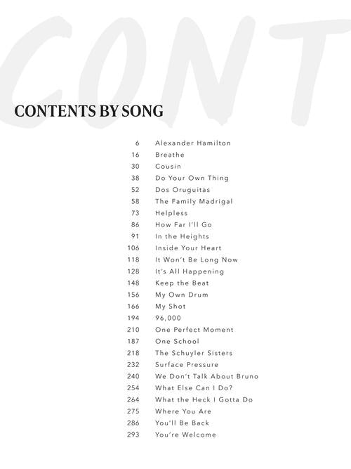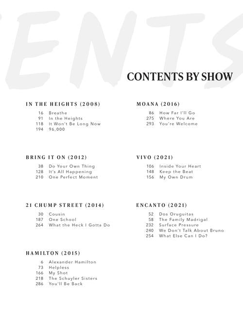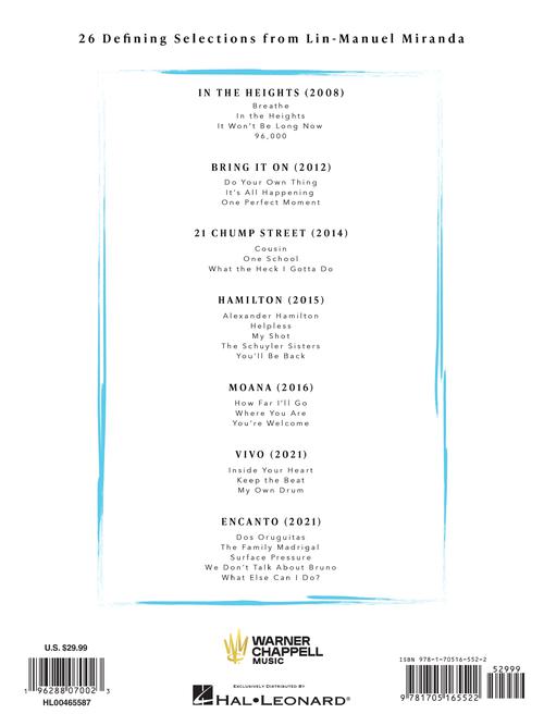 The Lin-Manuel Miranda Collection Publisher: Hal Leonard Category: Keyboard & Piano/Vocal/Guitar Series: P/V/G Composer Collection Format: Softcover This collection features 26 defining works from Lin-Manuel's career from In the Heights in 2008 to Encanto in 2021...Regular price $41.99