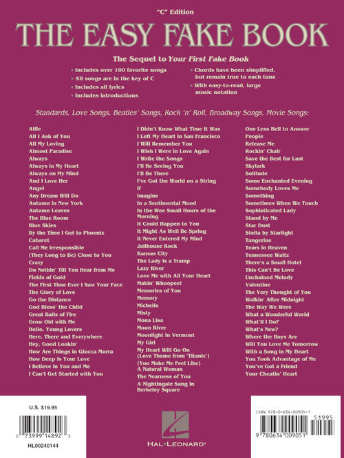 The Easy Fake Book Publisher: Hal Leonard Category: Keyboard & Piano/Vocal/Guitar Series: Easy Fake Book Format: Paperback This follow-up to the popular Your First Fake Book (00240112) includes over 100 more great songs that even beginning-level...Regular price $35.99 -