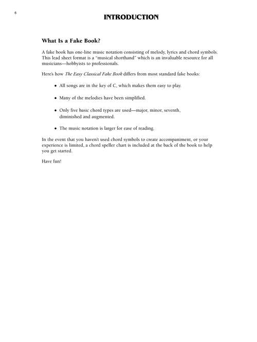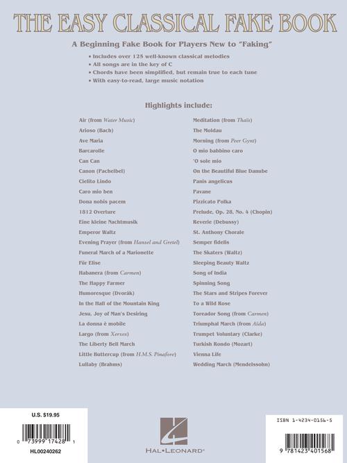 The Easy Classical Fake Book Melody, Lyrics & Simplified Chords in the Key of C Publisher: Hal Leonard Category: Keyboard & Piano/Vocal/Guitar Series: Easy Fake Book Format: Softcover Over 125 classical melodies including: Air (from Water...Regular price $27.99