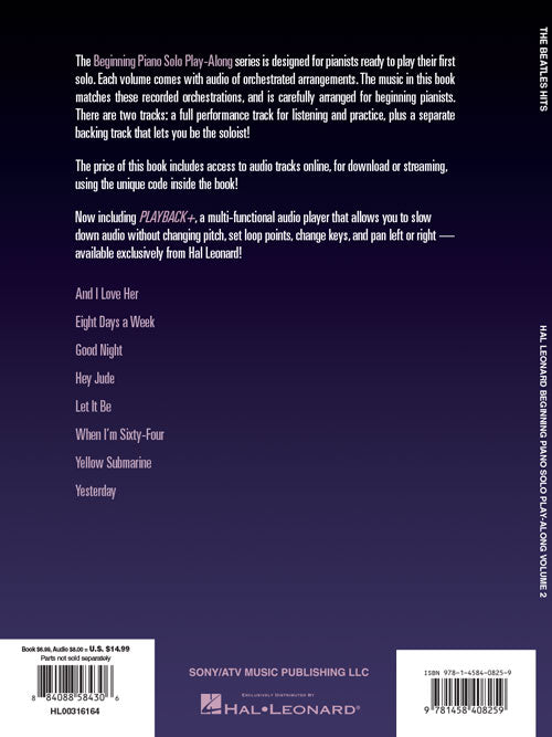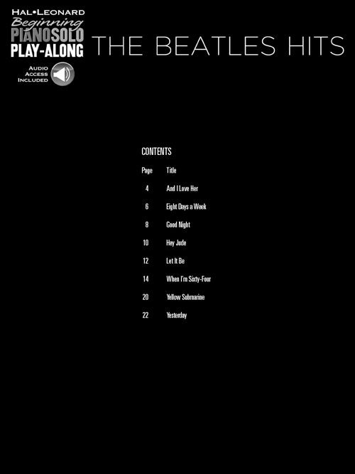The Beatles Hits Beginning Piano Solo Play-Along Volume 2 Publisher: Hal Leonard Category: Keyboard & Piano/Vocal/Guitar Series: Beginning Piano Solo Play-Along Format: Softcover Audio Online The Beginning Piano Solo Play-Along series is designed for pianists ready...Regular price $17.99 -