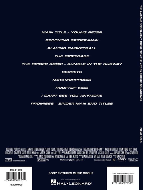 The Amazing Spider-Man Music from the Motion Picture Soundtrack Publisher: Hal Leonard Category: Keyboard & Piano/Vocal/Guitar Series: Piano Solo Songbook Format: Softcover Features piano solo arrangements of ten selections from James Horner's spectacular score soundtrack: Becoming...Regular price $17.99 -