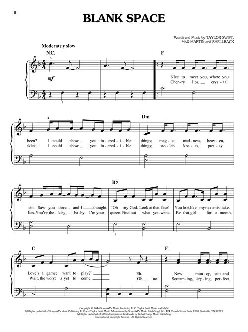 Taylor Swift - 1989 Publisher: Hal Leonard Category: Keyboard & Piano/Vocal/Guitar Series: Easy Piano Personality Format: Softcover Matching folio to Taylor's blockbuster 2014 release featuring easy piano arrangements for intermediate pianists. Songs include: Blank Space ยท...Regular price $27.99