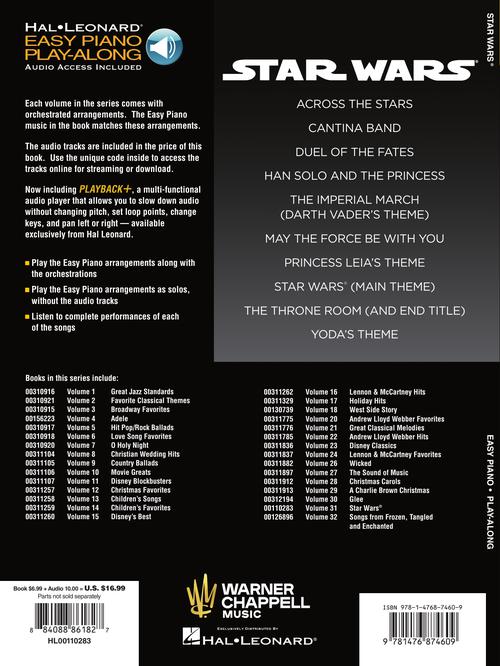 Star Wars Easy Piano Play-Along Volume 31 Publisher: Hal Leonard Category: Keyboard & Piano/Vocal/Guitar Series: Easy Piano Play-Along Format: Softcover Audio Online Each book in this series comes with recordings of complete professional performances, and includes...Regular price $22.99 -