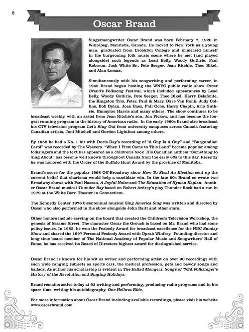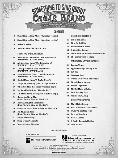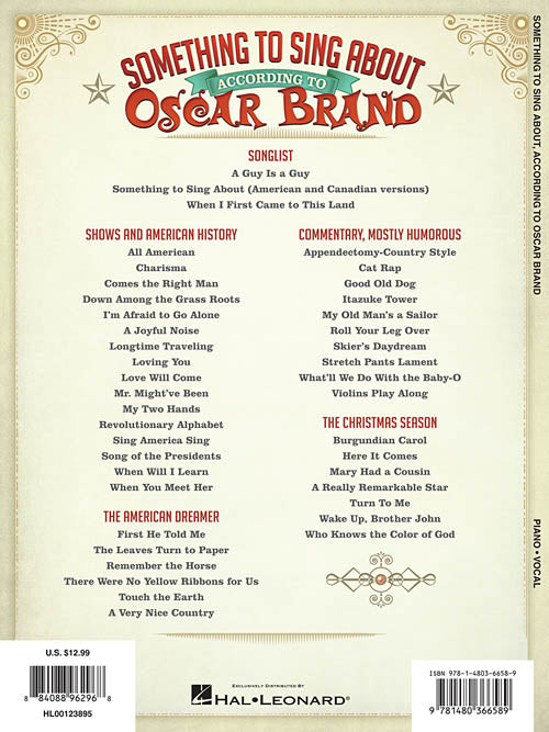 Composer: Oscar Brand Something to Sing About According to Oscar Brand Canada, American Politics, Christmas, Cats & Dogs, Sports Cars, Skiers, Doctors, Vietnam, Love... Softcover Oscar Brand is a stalwart American folk singer who has released...Regular price $15.99 -