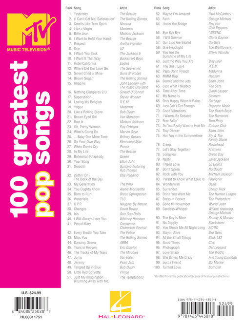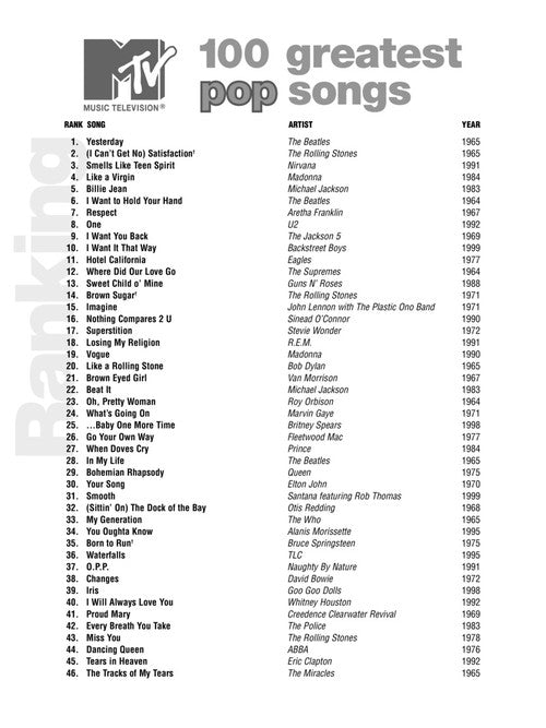 Selections from MTV's 100 Greatest Pop Songs Publisher: Hal Leonard Category: Keyboard & Piano/Vocal/Guitar Series: Easy Piano Songbook Format: Softcover A great collection of over 90 of the best and/or most influential pop songs of all...Regular price $53.99 -