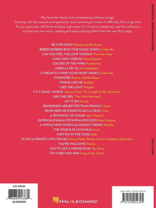 Sequential Disney Piano Songs 24 Easy Favorites Carefully Selected and Arranged in Order of Difficulty Publisher: Hal Leonard Category: Keyboard & Piano/Vocal/Guitar Series: Easy Piano Songbook Format: Softcover Players of all levels can enjoy their favorite...Regular price $23.99 -