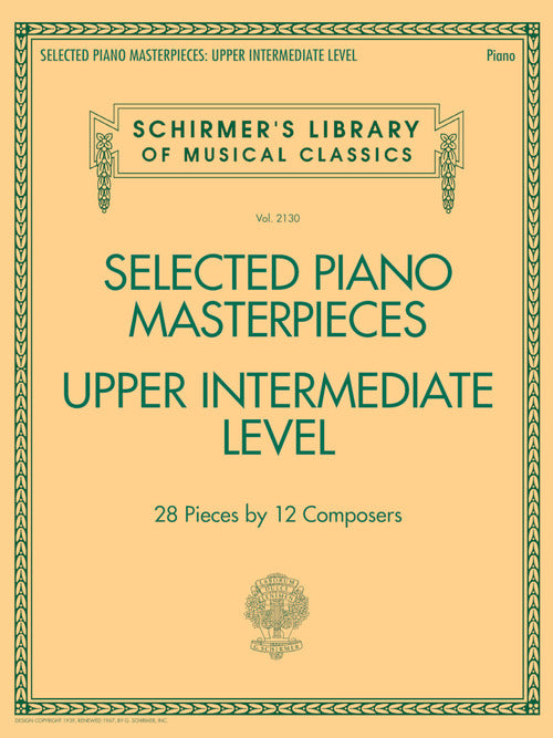 Selected Piano Masterpieces - Upper Intermediate Level Schirmer's Library of Musical Classics Volume 2130 Publisher: G. Schirmer, Inc. Category: Keyboard & Piano/Vocal/Guitar Series: Piano Collection Format: Softcover 28 pieces by JS Bach, Barók, Chopin, Debussy, Grieg,...Regular price $15.99