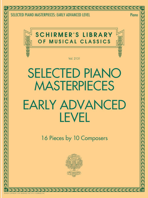 Selected Piano Masterpieces - Early Advanced Schirmer's Library Of Musical Classics Schirmer's Library of Musical Classics Volume 2131 Publisher: G. Schirmer, Inc. Category: Keyboard & Piano/Vocal/Guitar Series: Piano Collection Format: Softcover 16 pieces by Bartók, Beethoven,...Regular price $14.99 -