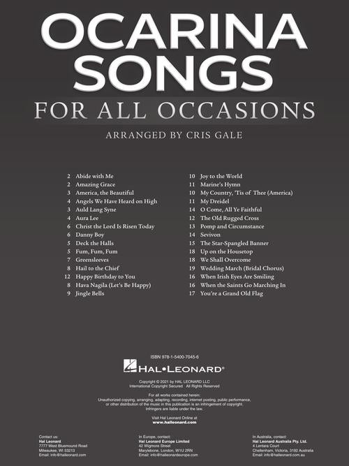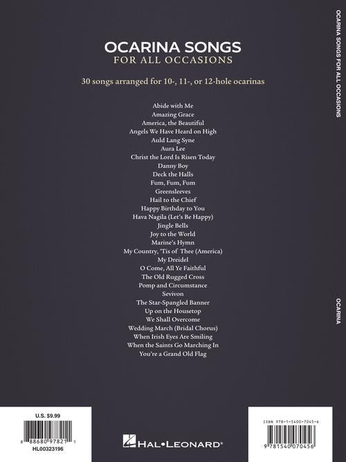 30 songs for every season arranged for the 10-, 11- or 12-hole ocarina. Includes: America, the Beautiful · Auld Lang Syne · Danny Boy · Happy Birthday to You · Joy to the World · The Old Rugged Cross · Pomp and Circumstance · Sevivon · The Star-Spangled Banner · Wedding March (Bridal Chorus) · When the Saints Go Marching In · and more.