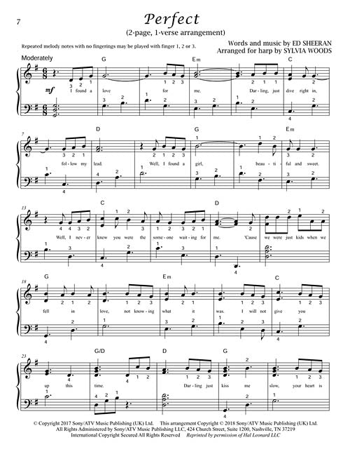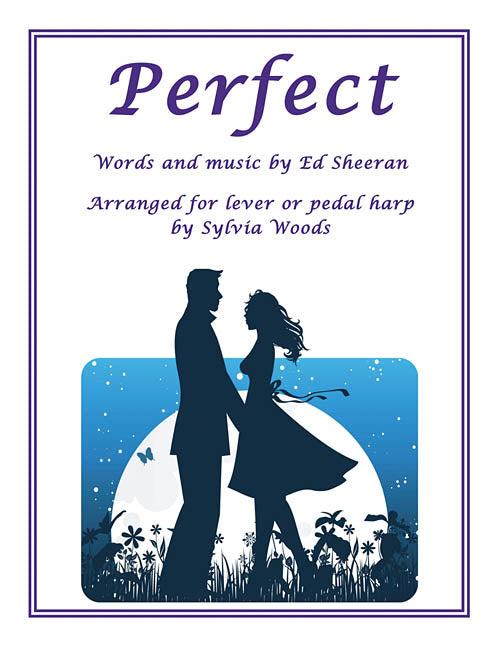 Sylvia Woods has included two harp arrangements of Ed Sheeran's Perfect in this folio. Both versions can be played on either lever harp or pedal harp. The first arrangement (pages 1 through 6) is the complete piece. The shorter, two-page version on pages 7 and 8 includes only the first verse. It is exactly the same as the first 52 measures of the complete version, with a short ending added. This version is perfect for wedding processionals, and other occasions when your playing time is limited, and you don't want to worry about turning pages.