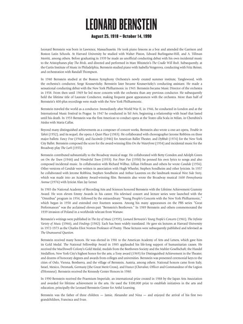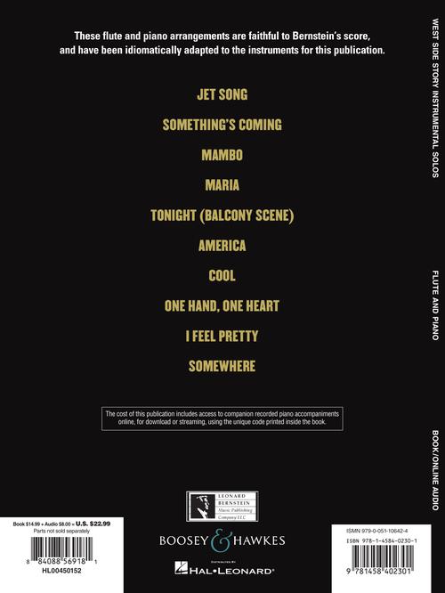 These solo instrumental arrangements are faithful to Bernstein's score, and have been idiomatically adapted to the instruments for these editions. Intermediate to Advanced Level. CONTENTS: Jet Song · Something's Coming · Mambo (replaced by Gee, Officer Krupke in Horn and Trombone books) · Maria · Tonight (Balcony Scene) · America · Cool · One Hand, One Heart · I Feel Pretty · Somewhere. The audio includes recordings of piano accompaniments. Audio is accessed online using the unique code inside the book and can be streamed or downloaded. The audio files include PLAYBACK+, a multi-functional audio player that allows you to slow down audio without changing pitch, set loop points, change keys, and pan left or right.