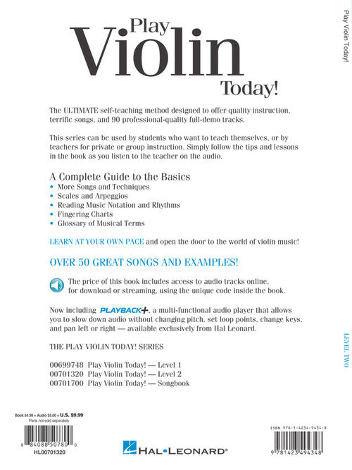 Play Violin Today! - Level 2A Complete Guide to the BasicsPublisher: Hal LeonardCategory: Solo InstrumentalSeries: Play Today Instructional SeriesFormat: Softcover Audio OnlinePerfect for students who want to teach themselves, or for teachers in private or group...Regular price $15.99