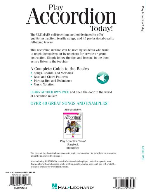 Play Accordion Today!A Complete Guide to the Basics Level 1Publisher: Hal LeonardCategory: Solo InstrumentalSeries: Play Today Instructional SeriesFormat: Softcover Audio OnlineThis is the ultimate self-teaching method designed to offer quality instruction, terrific songs, and high-quality audio...Regular price $15.99 -