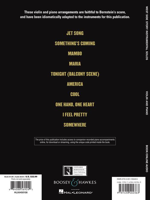 West Side Story Instrumental SolosArranged for Violin and Piano With Recordings of Piano AccompanimentsPublisher: Boosey & HawkesCategory: Solo InstrumentalSeries: Boosey & Hawkes Chamber MusicFormat: Softcover Audio OnlineThese solo instrumental arrangements are faithful to Bernstein's score, and...Regular price $27.99 -