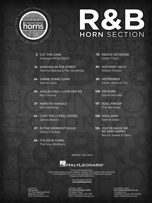 R&B Horn SectionTranscribed HornsPublisher: Hal LeonardCategory: Solo InstrumentalSeries: Transcribed HornsFormat: SoftcoverImagine playing the exact parts of some of the most memorable and consequential songs of our time note-for-note, exactly as the legends played them. This unique...Regular price $33.99