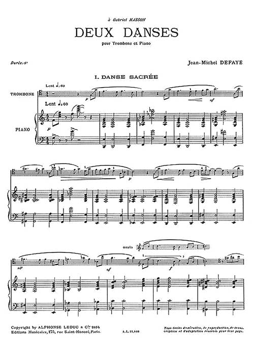 Composer: Jean-Michel DefayeTwo Dancesfor Trombone and PianoPublisher: Alphonse LeducCategory: Solo InstrumentalSeries: LeducFormat: SoftcoverComposed by Jean-Michel Defaye in 1954, Two Dances is the piece that put him under the international spotlight. Written for trombone and piano, it...Regular price $34.99 -