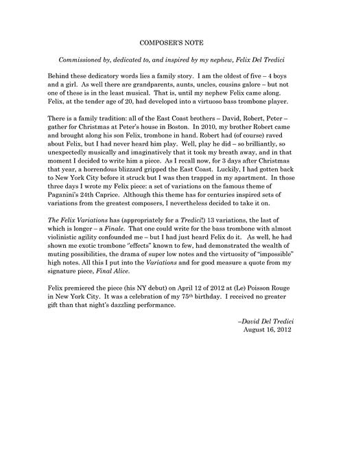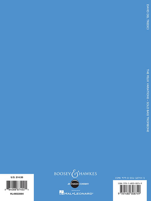 Composer: David Del TrediciThe Felix VariationsSolo Bass TrombonePublisher: Boosey & HawkesCategory: Solo InstrumentalSeries: Boosey & Hawkes Chamber MusicFormat: PaperbackA set of variations on the famous theme of Paganini's 24th Caprice. Commissioned by, dedicated to, and inspired...Regular price $17.99 -