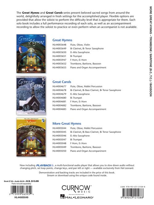 More Great HymnsBassoon/Trombone/EuphoniumPublisher: Curnow MusicCategory: Solo InstrumentalSeries: Curnow Play-Along BookFormat: Softcover with CDFollowing in the footsteps of Great Hymns, More Great Hymns features 13 songs of worship from around the world, delightfully arranged in fresh settings...Regular price $17.99 -