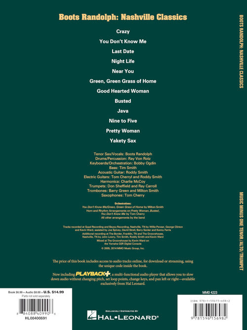 Boots Randolph - Nashville ClassicsMusic Minus One for Tenor Sax, Alto Sax or TrumpetPublisher: Music Minus OneCategory: Solo InstrumentalSeries: Music Minus OneFormat: Softcover Audio OnlineWorld-renowned saxophonist Boots Randolph has played with an incredible who's who of...Regular price $20.99