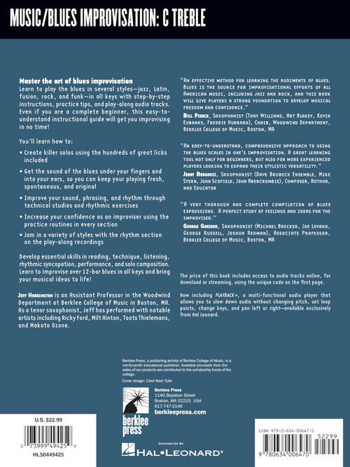 Blues Improvisation CompleteC Treble InstrumentsPublisher: Berklee Press PublicationsCategory: Solo InstrumentalSeries: Berklee LabsFormat: Softcover Audio OnlineLearn to play the blues in several styles - jazz, Latin, fusion, rock and funk - in all keys with step-by-step instructions,...Regular price $29.99 -