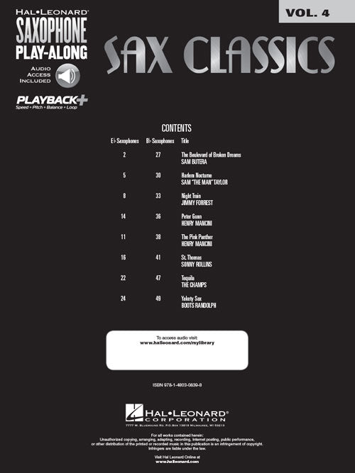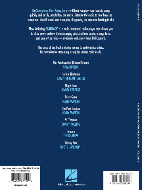 Sax ClassicsSaxophone Play-Along Volume 4Publisher: Hal LeonardCategory: Solo InstrumentalSeries: Saxophone Play-AlongFormat: Softcover Audio OnlineThe Saxophone Play-Along® Series will help you play your favorite songs quickly and easily. Just follow the notation, listen to the audio to...Regular price $23.99 -