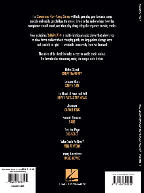 Classic RockSaxophone Play-Along Volume 3Publisher: Hal LeonardCategory: Solo InstrumentalSeries: Saxophone Play-AlongFormat: Softcover Audio OnlineThe Saxophone Play-Along(TM) Series will help you play your favorite songs quickly and easily. Just follow the music (including parts for B-flat and...Regular price $23.99 -
