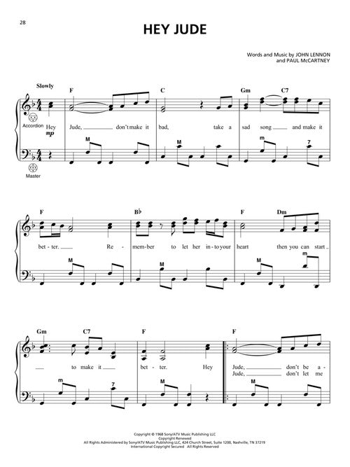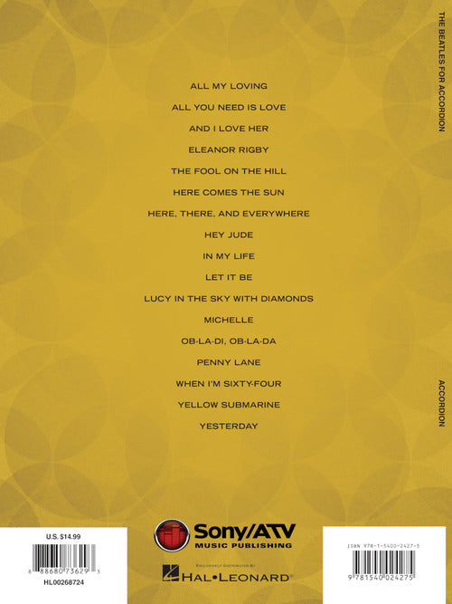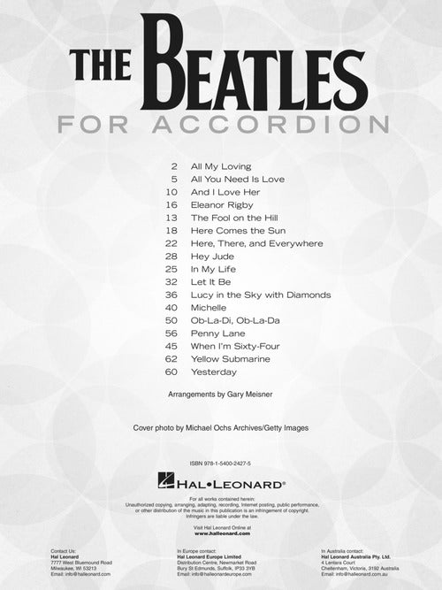 Artist: The BeatlesThe Beatles for AccordionPublisher: Hal LeonardCategory: Solo InstrumentalSeries: AccordionFormat: Softcover17 hits from the Lads from Liverpool have been arranged for accordion. Includes: All You Need Is Love · Eleanor Rigby · The Fool on...Regular price $22.99