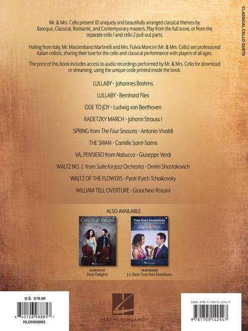Classical Cello DuetsArranged by Mr & Mrs CelloPublisher: Hal LeonardCategory: Solo InstrumentalSeries: Cello DuetFormat: Softcover Audio OnlineMr & Mrs Cello (Massimiliano Martinelli & Fulvia Mancini) present 10 uniquely and beautifully-arranged classical themes for students by Baroque,...Regular price $23.99 -