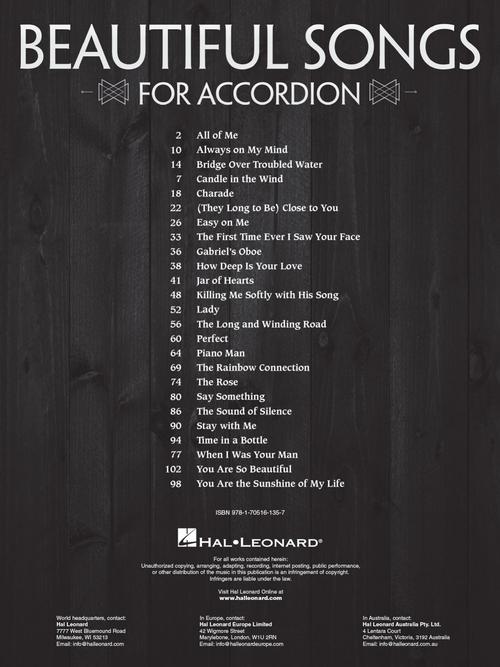 Beautiful Songs for AccordionPublisher: Hal LeonardCategory: Solo InstrumentalSeries: AccordionFormat: Softcover25 gorgeous songs, including: Bridge over Troubled Water · Candle in the Wind · (They Long to Be) Close to You · Easy on Me · How...Regular price $23.99 -