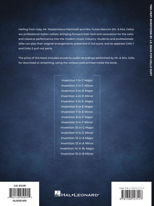 Two-Part Inventions by J.S. Bach for Cello DuetArranged by Mr & Mrs CelloPublisher: Hal LeonardCategory: Solo InstrumentalSeries: Cello DuetFormat: Softcover Audio OnlineHailing from Italy, Mr. Massimiliano Martinelli and Mrs. Fulvia Mancini (Mr & Mrs Cello) are...Regular price $23.99 -
