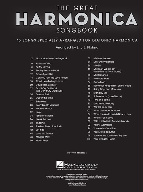 The Great Songbook45 Songs Specially Arranged for Diatonic HarmonicaPublisher: Hal LeonardCategory: Solo InstrumentalSeries: HarmonicaFormat: SoftcoverThe songbook no harmonica player should be without! Features 45 pop, rock, Broadway, movie hits and standards: Brown Eyed Girl ยท Daydream...Regular price $23.99 -