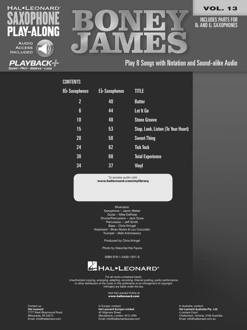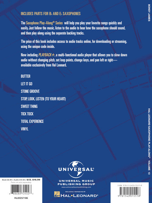 Boney JamesSaxophone Play-Along Volume 13Publisher: Hal LeonardCategory: Solo InstrumentalSeries: Saxophone Play-AlongFormat: Softcover Audio OnlineThe Saxophone Play-Along® Series will help you play your favorite songs quickly and easily. Just follow the notation, listen to the audio to...Regular price $20.99 -