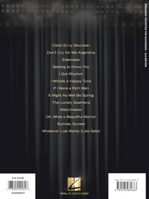 Composer: VariousBroadway Favorites for Accordion - 2nd EditionPublisher: Hal LeonardCategory: Solo InstrumentalSeries: AccordionFormat: Softcover13 songs from the Great White Way, including: Climb Ev'ry Mountain · Don't Cry for Me, Argentina · Getting to Know You ·...Regular price $13.99