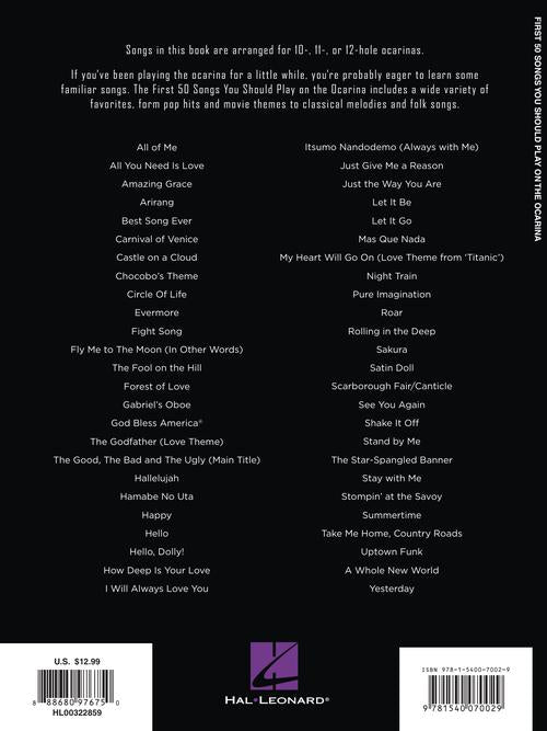 First 50 Songs You Should Play On OcarinaPublisher: Hal LeonardCategory: Solo InstrumentalSeries: OcarinaFormat: SoftcoverOne-of-a-kind collection of accessible, must-know favorites from the Beatles to Adele, folk songs, to movie soundtracks, and more! Songs in this book are...Regular price $17.99 -