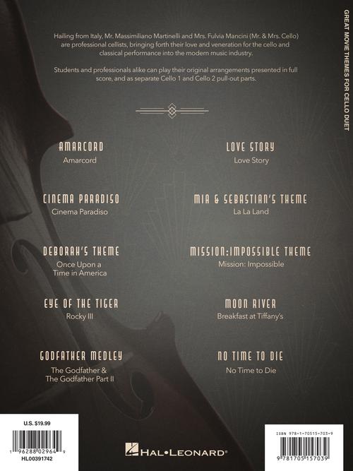 Great Movie Themes for Cello DuetArranged by Mr & Mrs CelloPublisher: Hal LeonardCategory: Solo InstrumentalSeries: Cello DuetFormat: SoftcoverHailing from Italy, Mr. Massimiliano Martinelli and Mrs. Fulvia Mancini (Mr & Mrs Cello) are professional cellists, bringing forth...Regular price $23.99 -