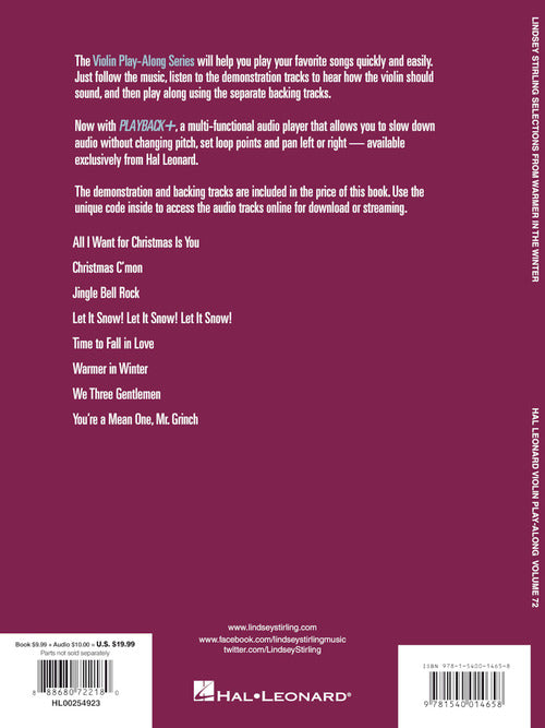 Lindsey Stirling - Selections from Warmer in the WinterViolin Play-Along Volume 72Publisher: Hal LeonardCategory: Solo InstrumentalSeries: Violin Play-AlongFormat: Softcover Audio OnlineThe Violin Play-Along series will help you play your favorite songs quickly and easily. Just follow...Regular price $23.99 -