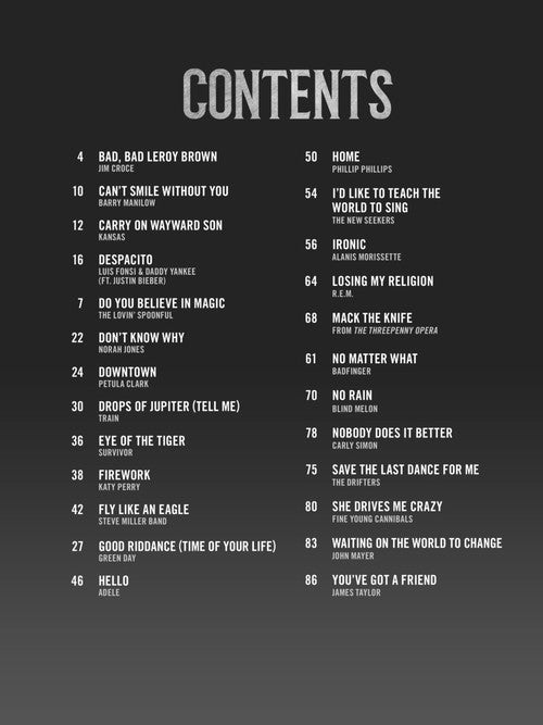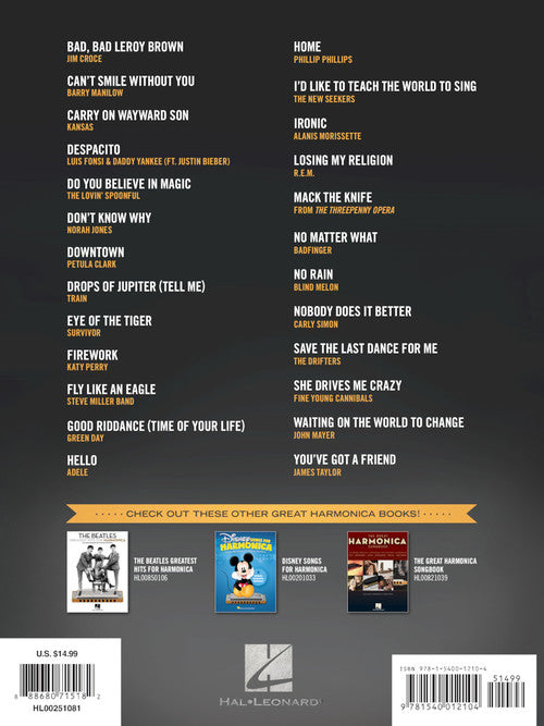 Popular Songs for 25 Modern & Classic Hits Arranged for Diatonic HarmonicaPublisher: Hal LeonardCategory: Solo InstrumentalSeries: HarmonicaFormat: SoftcoverGuitar Tab: YES25 must-know songs for harmonica including harmonica tablature: Bad, Bad Leroy Brown (Jim Croce) · Carry on...Regular price $17.99 -